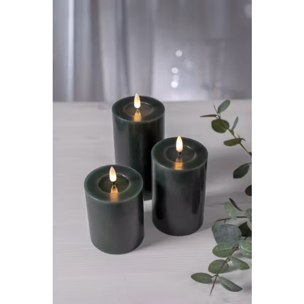 Flamme Flow är ett batteridrivet blockljus med vår naturtrogna låga Flamme med en brinntid på cirka 1500 timmar. Detta stearinljus har en blank nedsänkning under lågan, denna yta ser ut som flytande vax vilket gör ljuset än mer naturtroget. Ljuset är cirka 7,5cm i diameter och höjden 10cm för vax delen och cirka 12,5cm med lågan. Detta ledljus blir en vacker dekoration, både ensam och i grupp ihop med övriga ljus från vår Flamme serie. Den har timerfunktion och när brytaren är på timerläget lyser ljuset i ca 250 dagar med en vacker realistisk låga i varmvitt. Den drivs av 2 AA batterier, dessa ingår ej.