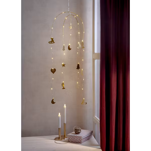 Hängande dekorativ mobil med belysning. Fina vintermotiv i mässing som skapar julkänsla. De små ljuspunkterna reflekteras fint i de vintriga mässingsornamenten och ger ett fint sken. Extra lång kabel som gör det enkelt att hänga den ovanför ett fönster eller kanske i ett mörkt hörn. Drivs av batteri.