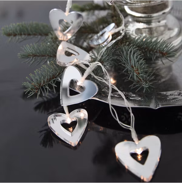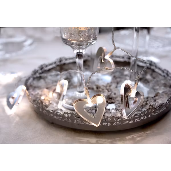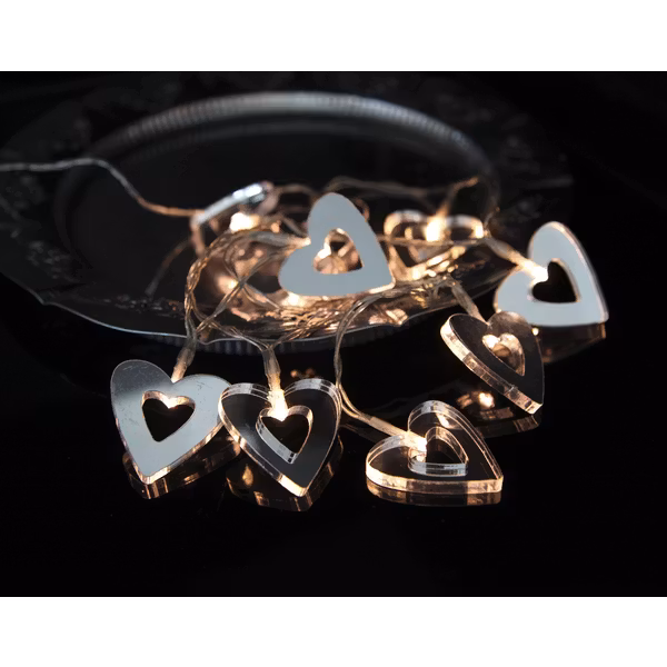 Fin dekorationsslinga med 10 LED-ljus-hjärtan med spegeleffekt. Kan användas vid diverse dekorationer, tex dukningar, blomsterarrangemang, på väggen osv. Slingan är batteridriven och har en smidig timerfunktion. Dekorationerna är försedda med skyddsplast som skall tas bort före användning.