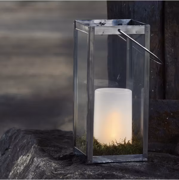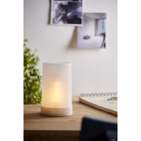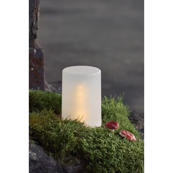 Litet frostat plastljus med dansande Flame låga inuti, med inbyggd timer. Fin att sätta i lyktor utomhus.