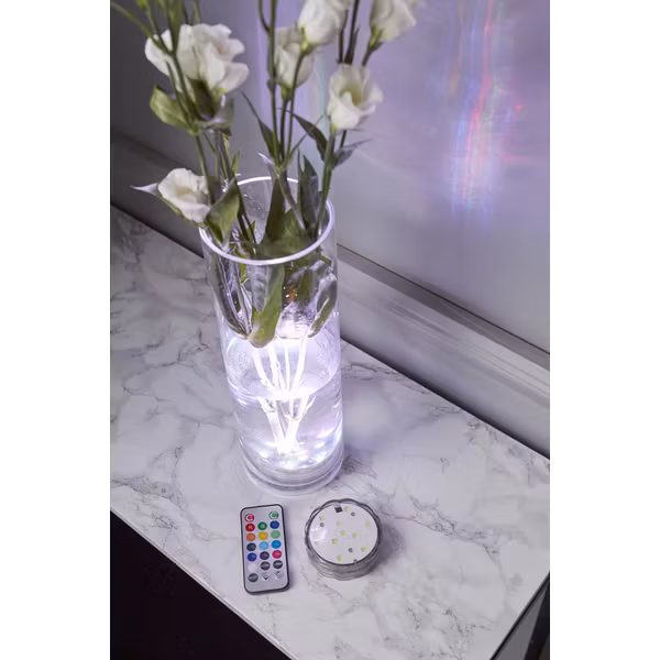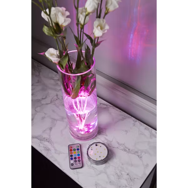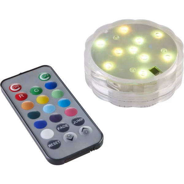 Vattentät dekorationspuck med LED-ljus. Pucken är batteridriven och har många färgval i ljusskenet som ställs in med hjälp av den medföljande fjärrkontrollen. Kul i vasen som i bålen, riktig partyhöjare.