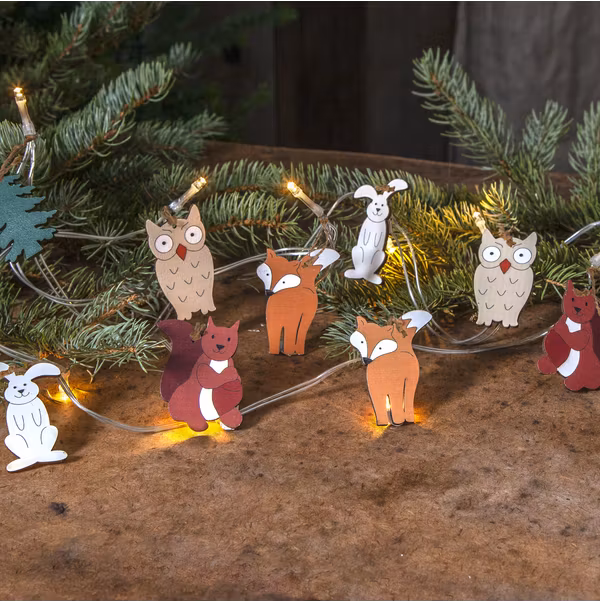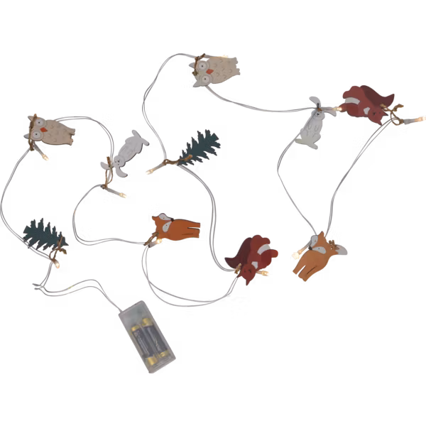 Ljusslinga för inomhusbruk dekorerad med 10 st träfigurer i vackra färger. Figurerna är fastknutna med hampasnöre. Dekorativ inredning som ger ett mysigt sken i hemmet.