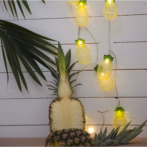 Batteridriven ljusslinga med 10 varmvita LED-lampor. Underbar ljusslinga att dekorera med till vardags och fest. Ljusslingan är transparent och dekorerad med gula ananaser. Den inbyggda timern gör det lätt att ställa in när ljusslingan ska lysa.