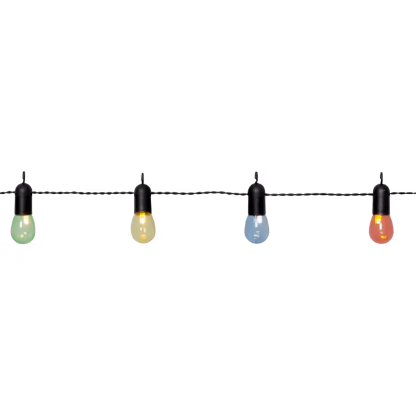 En ljusslinga med 16 lite mindre flerfärgade höljen, med varmvita LED-ljuskällor för utomhusbruk. Ger ett vackert och mysigt ljus i mörkret.