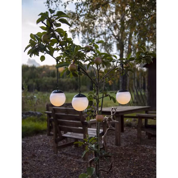 Vår hängande solcellsbelysning Globus i 3 pack är tillverkad i vit PS plast som är 10cm i diameter och går lätt att hänga upp med hjälp av den medföljande 13cm långa kedjan och krokodilklämman. Denna hängande solcellsdekoration lyser upp med varm vitt sken i mörkret. Solcellsbelysningen passar utmärkt att placera som dekoration i din trädgård, balkong eller terrass. Placera solcellsdekorationen där solen kan nå panelen under dagen för att få ultimat laddning till det medföljande batteriet.