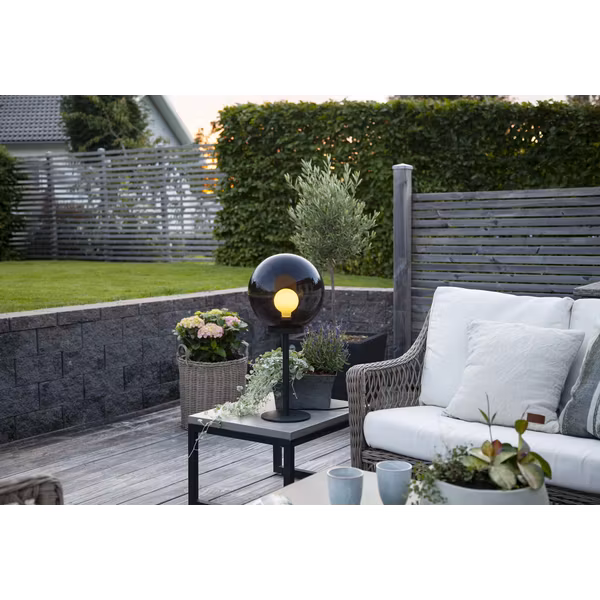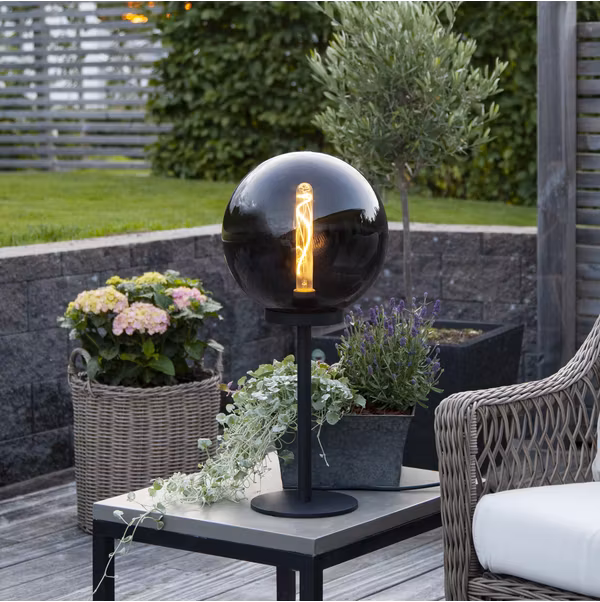 Exklusiv bordslampa med rökfärgad glob i akryl, avsedd att användas på uteplatsen, altanen eller balkongen. Förändra ljusskenet genom att prova olika typer av ljuskällor, max 40W. 230V och för ljuskällor med E27 sockel (exkl) som är mindre än 11 cm diameter